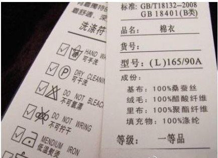 如果用L、M、X等来表示大小,则是不符合标准的,这样的产品只能告诉我们它的生产厂家不用心,那么质量上很难让我们再信赖。正确的合规的标注是使用号型标,如“175/88A”。两个数字分别表示身高和胸腰围,后面的英文字母表示体型。