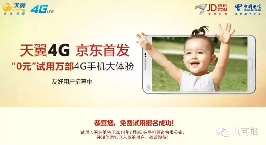 7月1日,京东高调宣布开启4G天翼万人0元使用项目!用户只需要上京东注册相关信息,就有可能0元试用4G天翼手机!仓库里已备好10000台价值1799的酷派S6 4G手机+10000张4G免费体验卡!快递小哥们摩拳擦掌,就等你了!