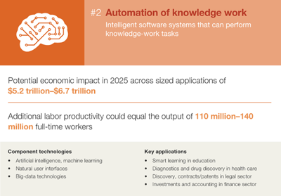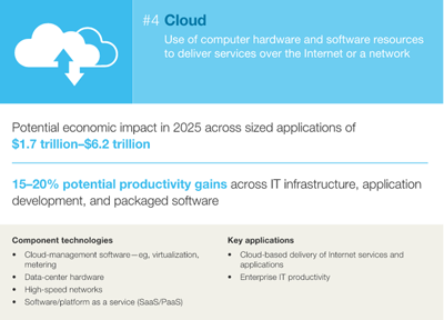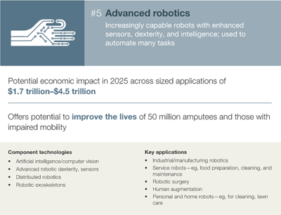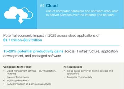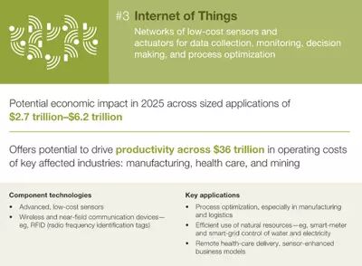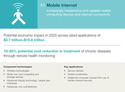 如上表所示,麦肯锡认为,未来10多年最具经济影响性的技术应该是那些已经取得良好进展的技术—如已经在发达国家普及并在新兴国家蓬勃发展的移动互联网;知识工作的自动化,比方说用计算机语音来处理大部分的客户电话;物联网,比方说将传感器嵌入物理实体中用来监控产品在工厂的流动;以及云计算。按照麦肯锡的估算,到2025年,这些技术每一个对全球经济的价值贡献均超过1万亿美元(即便是预测的下限)。