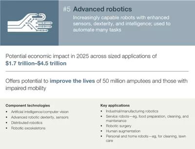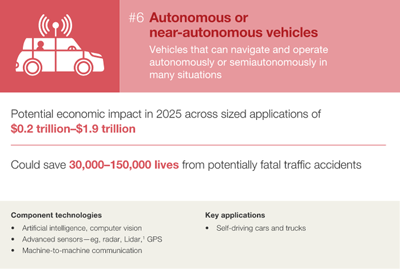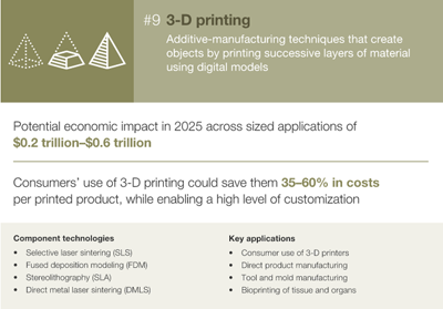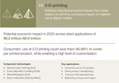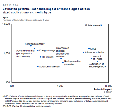 不过麦肯锡的报告中令人感兴趣的预测是,一些比较性感的新潮技术,如无人驾驶汽车、3D打印、可再生能源等的经济影响相对较低。