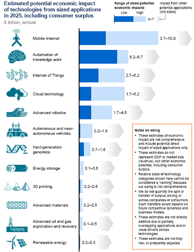 以下就是麦肯锡列举的颠覆性技术及其潜在的经济影响程度(含消费者盈余在内,即消费者并未支付的因创新而获得的价值),当然,这种影响评估只是粗略的,不会像GDP数字那么具体。