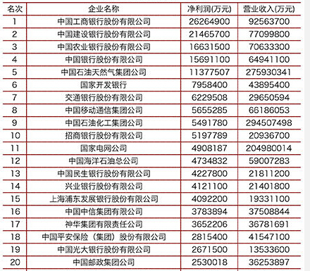 与上一年度相比,榜单前十位的企业没有发生变化,中石化、中石油、国家电网、工商银行、建设银行仍依次位列前五位,农业银行、中国建筑分别前进1位,中国移动退居第八位。