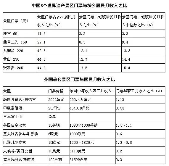 据国家统计局资料,2011年全国大陆总人口为13.47亿人,其中城镇人口6.91亿,农村人口6.56亿。农村居民人均年纯收入6977元(人均月收入516元)。城镇居民人均年可支配收入21810元(人均月收入1818元),城镇居民人均年可支配收入19118元(人均月收入1593元)。以故宫等5个世界自然或文化遗产的旺季门票为例,它们的门票价相当于农村居民人均月纯收入的11.6%~44.8%,相当于城镇居民人均月可支配收入的3.3%~13.5%,相当于城镇居民人均月可支配收入中位数的3.8%~15.4%。