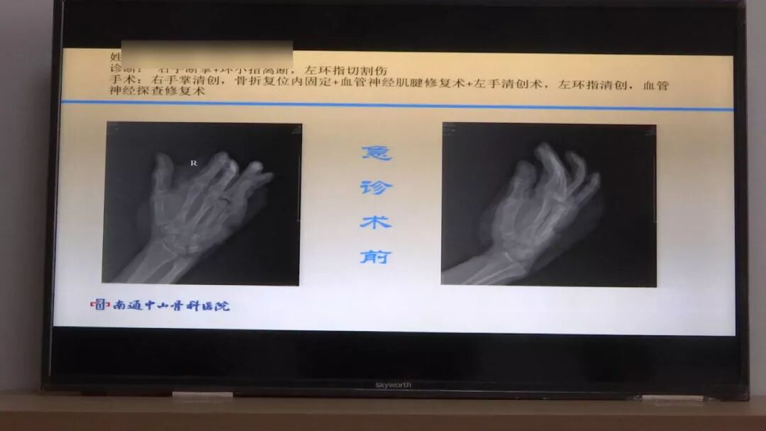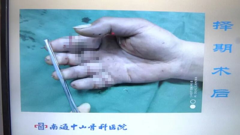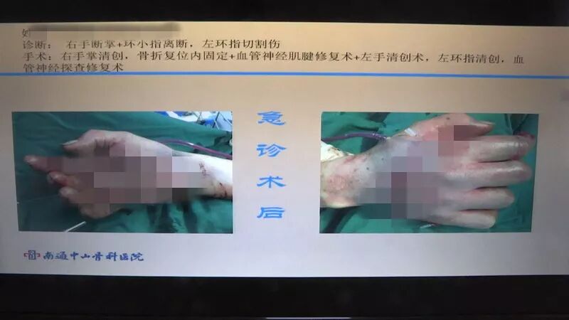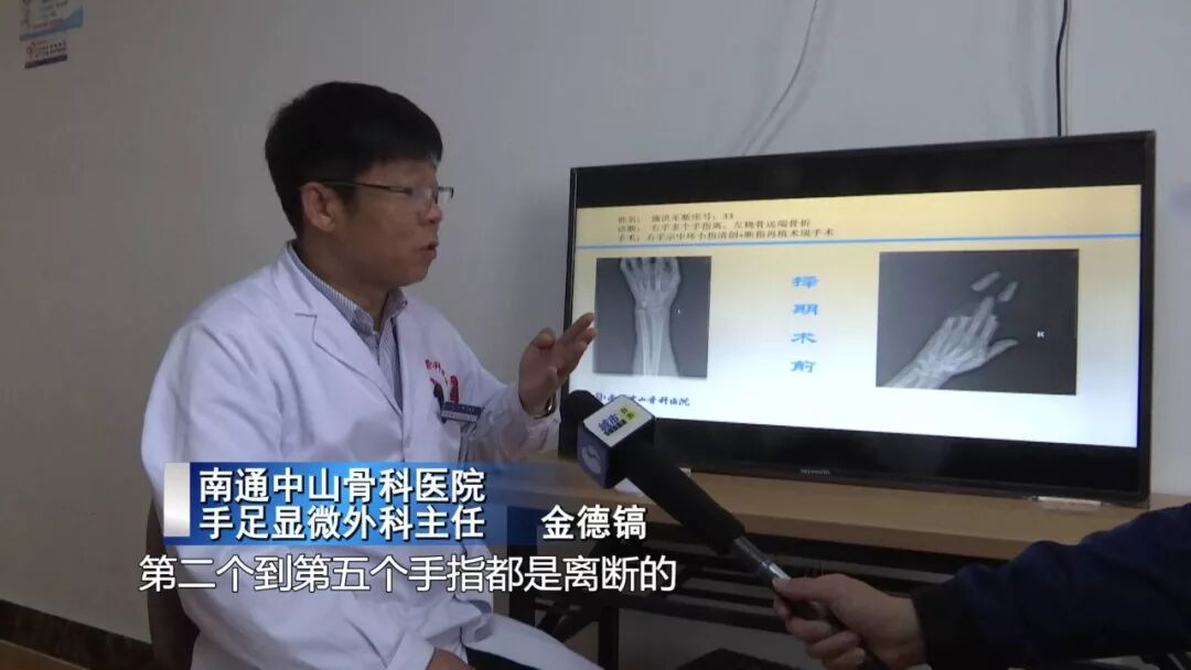 南通中山骨科医院手足显微外科主任 金德镐:(其中一个)患者当时来的时候,第二个到第五个手指都是离断的,虽然第三根手指连着,但是只是连着骨头,所有的血管神经、肌腱都是离断的。