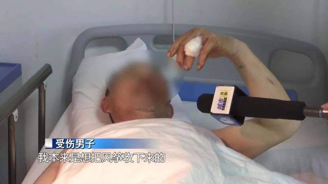 受伤男子:我本来是想把风筝收下来的,那时风还没到,还有十分钟,我收了一半的线,突然风太大了,缠在手上的线扔又扔不掉,直接抽上去了。