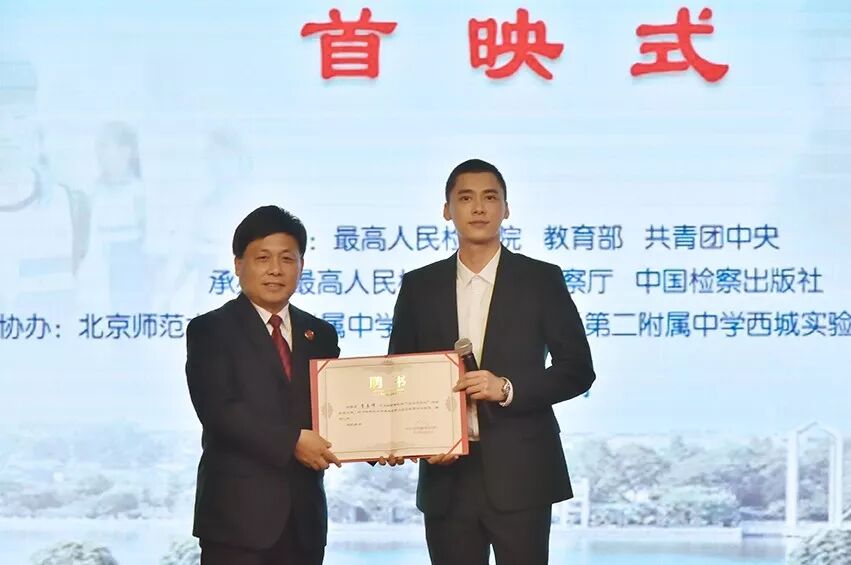 最高人民检察院第九检察厅厅长史卫忠为李易峰颁发聘书,聘请他为全国检察机关“法治进校园”活动形象大使。
